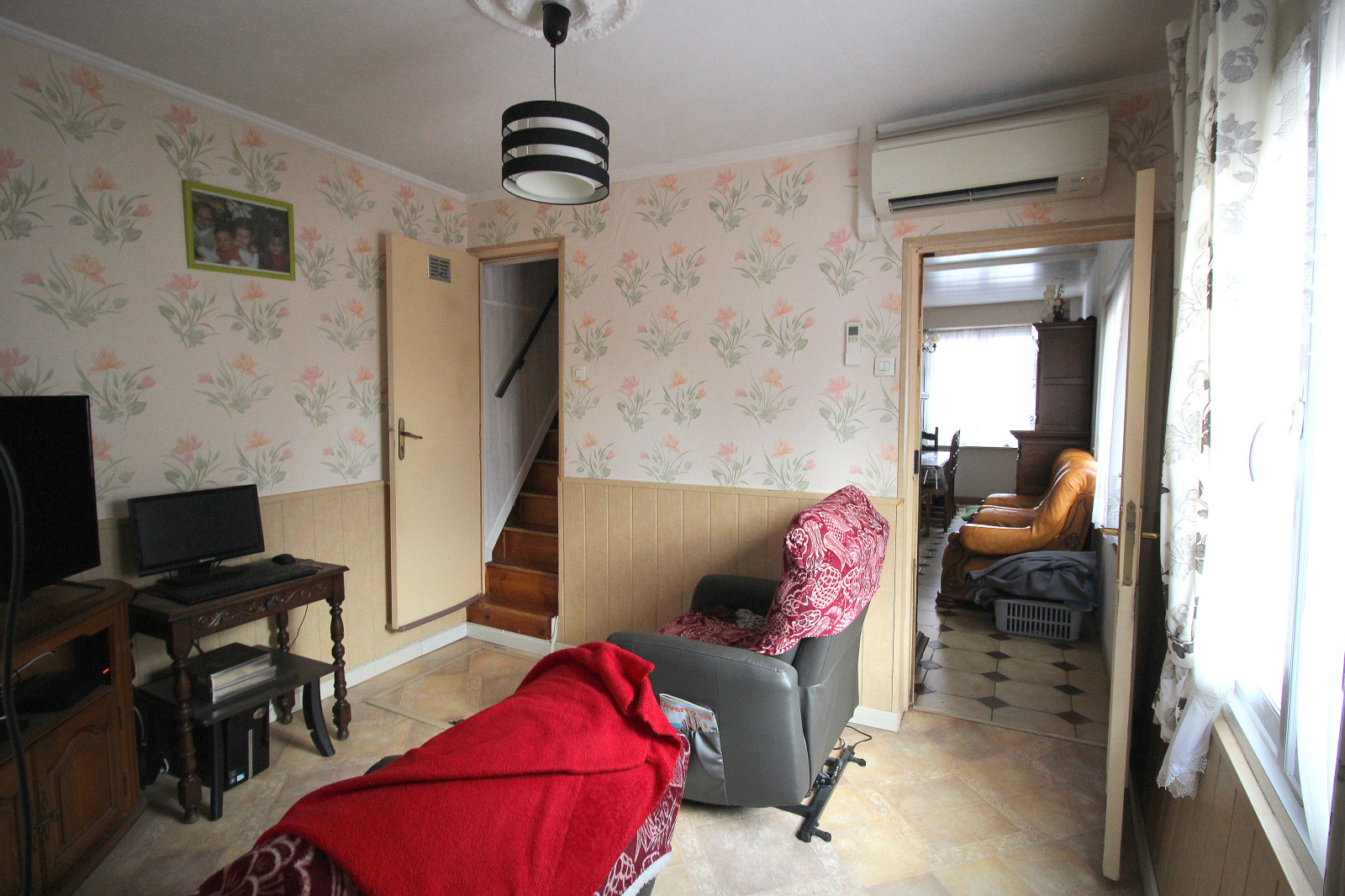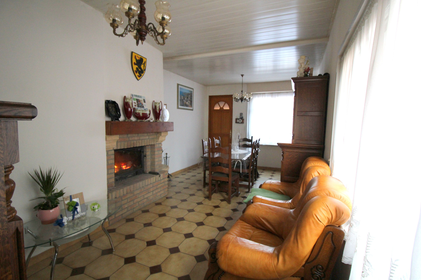 Maison 1 mitoyenneté offrant une pièce de vie avec cheminée, un coin salon, une grande cuisine, une salle de douche avec wc séparé.
